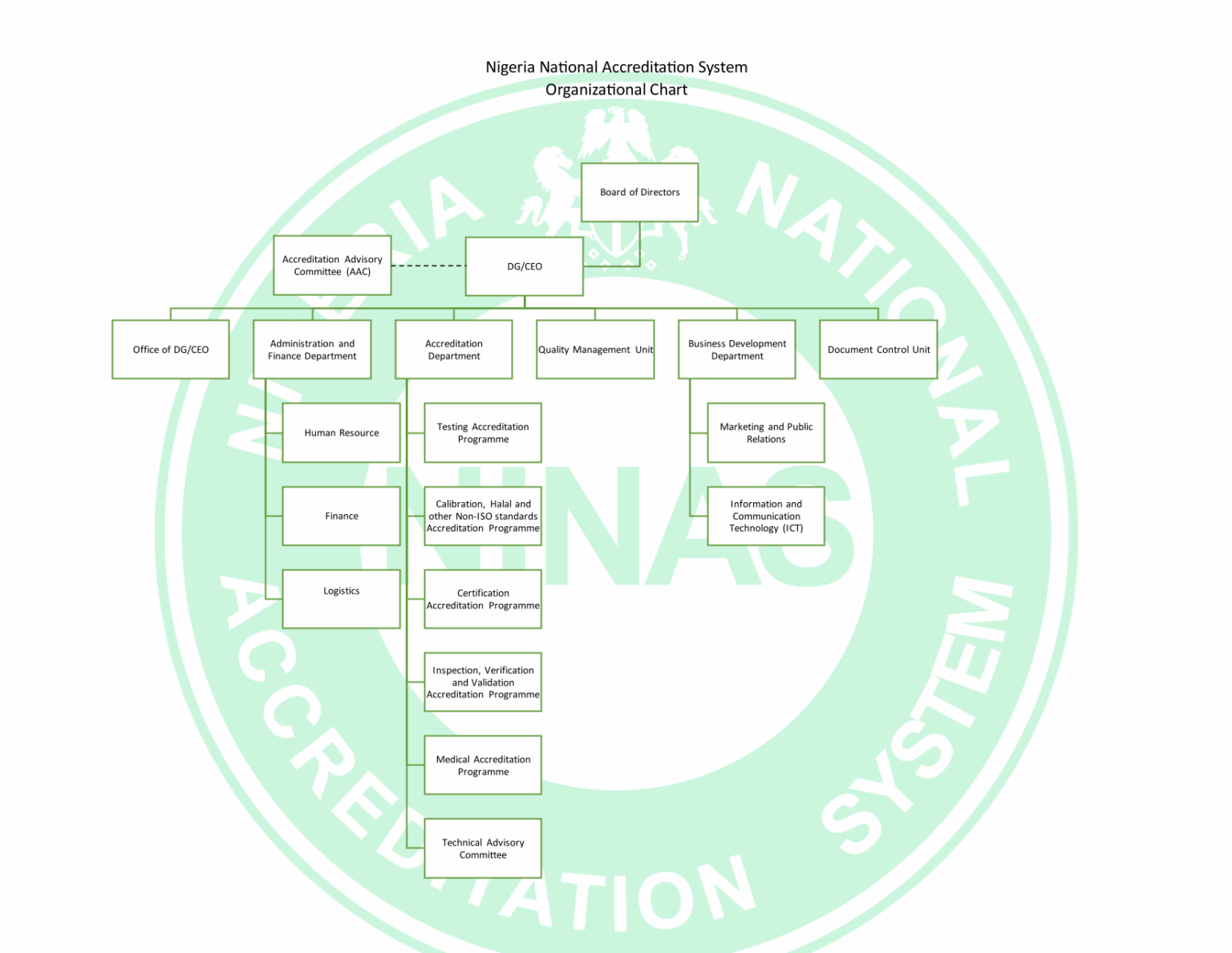 The NiNAS Governance Structure includes several committees comprising of a broad range of Nigerian stakeholders to ensure that NiNAS operated in a fair and unbiased manner assuring transparency and integrity. The structure which meets international requirements because of the balance of stakeholder involvement comprises of a Board of Directors and an Accreditation Policy Advisory Committee.