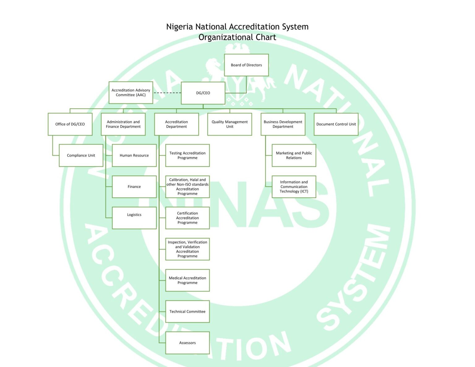 The NiNAS Governance Structure includes several committees comprising of a broad range of Nigerian stakeholders to ensure that NiNAS operated in a fair and unbiased manner assuring transparency and integrity. The structure which meets international requirements because of the balance of stakeholder involvement comprises of a Board of Directors and an Accreditation Policy Advisory Committee.
